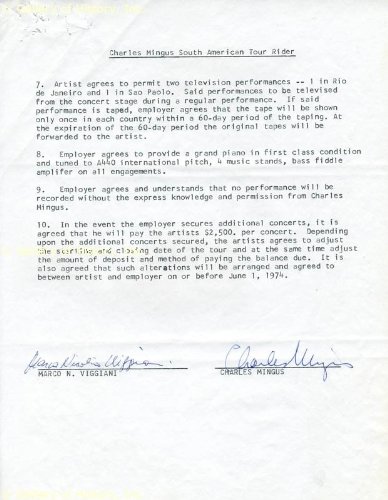 CHARLIE MINGUS - DOCUMENT SIGNED CIRCA 1974 CO-SIGNED BY: MARCO N. VIGGIANI . CHARLES "CHARLIE" MINGUS He signs a 2-page document (1974) detailing arrangements for his quintet's tour of South America that year, accompanied by a series of unsigned filed copies of letters related to the tour. Typed DS: "Charles Mingus" on second page, 2 pages, 8½x11, separate sheets. No place, circa 1974. Headed: "Charles Mingus - South American Tour Rider". Details for the performances of the Charles Mingus Quintet in South America between August 1-12, 1974. Ten points are listed, including the duration of the concerts (two hours, including intermission, with no more than one concert per day), transportation (five round-trip economy and one first-class plane fare from New York City to the initial engagement in South America), accommodations (first class hotel accommodations for six people), payment terms ($20,000, broken down into five installments), billing (Mingus was to receive 100% top billing), two television performances and other considerations (including provision of a grand piano, four music stands and a bass fiddle amplifier). Also signed: "Marco N. Viggiani", a Brazilian concert promoter. Lightly creased with folds, not at signatures. Staple holes at upper left margin and corner. Ink notes (unknown hand) on first page. Overall, fine condition. Accompanied by Photocopied Addendum signed: "Marco N. Viggiani", 1 page, 8½x11. Rio de Janiero, 1974 July 15. Addendum to clauses two and four of the Rider above. Clause two is amended to change the dates to August 7-20, 1974, with a total of six performance in 12 days. Clause four was changed the agreed-upon wage to $15,000. Lightly creased. Black marks touch signature and text (all legible). Overall, fine condition. With a number of supporting documents, unsigned, including: a carbon reference to this Rider; a copy of a January 3, 1974 letter from Mingus' booking agent, Jack Whittemore, noting... For more information contact HistoryForSale. DOCUMENT 274618