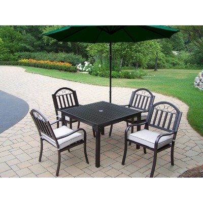 | Oakland Living Rochester 40 x 40 in. Patio Dining Set with Cantilever Umbrella #Take your next dinner outdoors to the Oakland Living Rochester 40 x 40 in. Patio Dining Set with Cantilever Umbrella. The dining set includes a 40-inch table, four dining chairs, and a cantilever umbrella. The table and chairs are made from durable tubular iron which holds up well to inclement conditions. Meanwhile, a hardened powder-coat finish in hammer-tone bronze also protects from fading and chipping. The Oakland Rochester Collection combines practical designs and modern style, with a traditional latticed and slatted pattern that's sure to please. The chairs are available with or without cushions, and the umbrella comes in your choice of vibrant colors. Each piece is hand-cast and finished for the highest quality possible. Includes a one-year limited manufacturer's warranty. Dimensions: 40L x 40W x 29.5H inches.