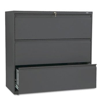 NEW - 800 Series Three-Drawer Lateral File, 42w x 19-1/4d x 40-7/8h, Charcoal - 893LS?Three-part, telescoping, steel ball bearing suspension for smooth drawer operation. Drawers include side-to-side hangrails for letter or legal size filing, a full-width radius-style pull and magnetic label holder. Mechanical interlock allows only one drawer to be open at a time. Four adjustable leveling glides help compensate for uneven flooring. HON? "One Key" interchangeable core removable locks. Counterweight inhibits tipping. Color: Charcoal; Overall Width: 42"; Overall Depth: 19 1/4".