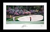 | ✚✚✚ Tiger Woods Autographed "Azalea #13" 40x25 Panoramic Photo - Unframed and Limited to 100 A huge reason for Tiger Woods's success at the Masters has been his ability to tame the varied obstacles offered up at Augusta National Golf Club's famed course. From strategically placed water hazards and bunkers to tight fairways and uphill greens, the degree of difficulty can be daunting. But along with its assorted challenges, Augusta is also known for its scenery. One of the most picturesque landscapes on the course is at hole No. 13. Fittingly named "Azalea," the 13th hole gets its name from the hundreds of beautiful azaleas lining its boundaries. Upper Deck delivers an authentic snapshot of Tiger playing at the Masters with this autographed panoramic print of Tiger executing a pitch shot in front of a gallery of azaleas at the 13th green. The print is produced on P-Velvet archival paper that measures approximately 40 1/8'' wide x 25'' high. Tiger's signature is guaranteed authentic through Upper Deck Authenticated's patented five-step process. Order now!